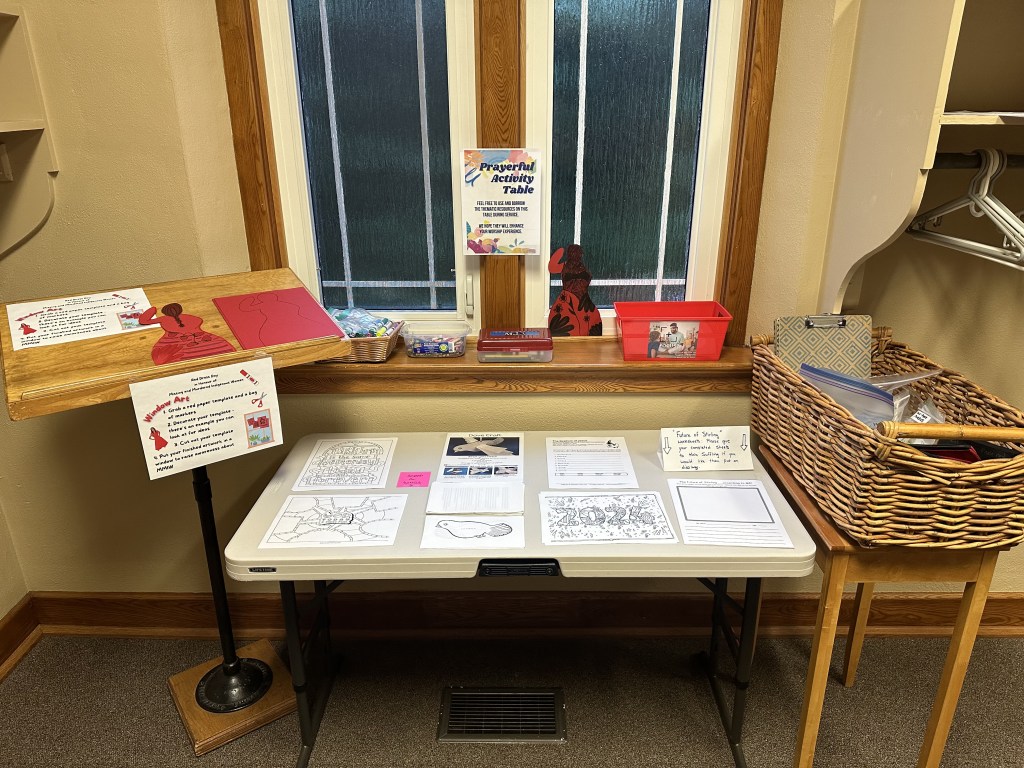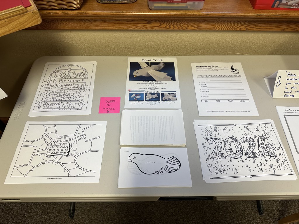 This year, our church is celebrating our 100th anniversary, and this week’s service was on the present. For the activity table, I tried to find things relevant to being in this moment, together. The scripture chosen for this week was Matthew 3:1-17, so some of the activities are focused on the Baptism of Jesus.