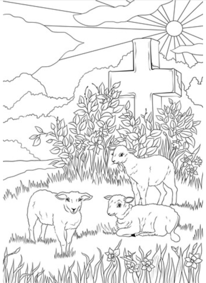 Easter lambs and Jesus’ cross colouring page from Super Coloring. (free)