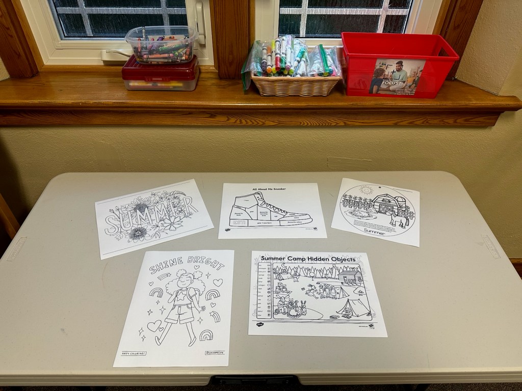 This week is themed around the Vacation Bible School that our congregation participates in, which this year used the Seekers in Sneakers curriculum. For fun, I figured I’d lean into a sneakers and summer theme for the activity table. I kept this one a bit leaner, because attendance in the summer is not always as robust.