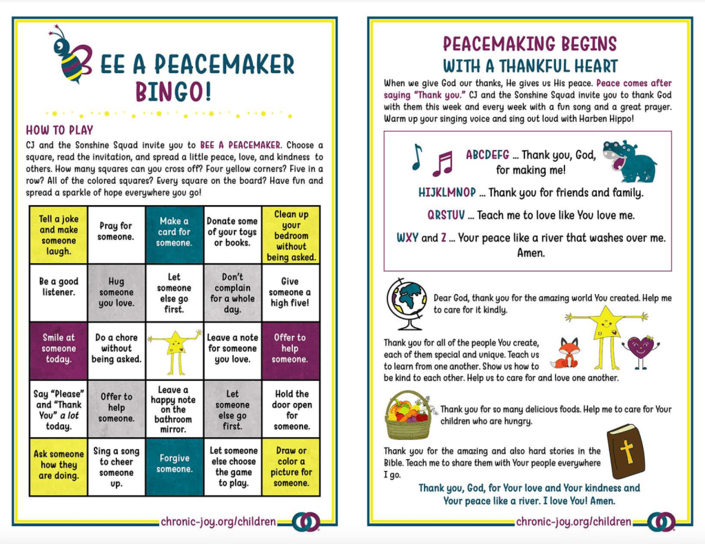 Bee a Peacemaker Bingo from Chronic Joy (free).