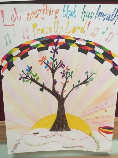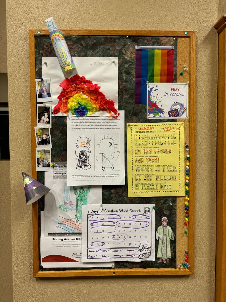 We had an under-used bulletin board in our narthex, so over the past several months, I have been surreptitiously adding bits and pieces from the activity table to it to display some of the end results of the resources. Some are examples I’ve made, and some are things that kids have left on the table after service. I don’t know how long it will last, but I’m enjoying it for now!