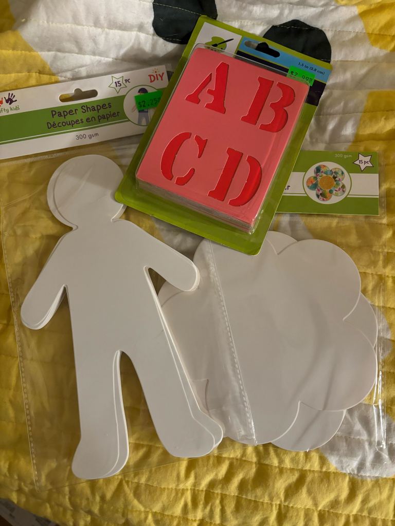 I’ve been doing some low-cost updates to our materials, including making sure that there are self-contained sharpeners in all of our pencil cases that have pencil crayons, and making sure that all our colouring materials have sustainable cases, rather than being stuck in Ziplock bags as they originally were. In all of this, I also grabbed a few papercraft items just from our local dollar store that I will use for future tables!