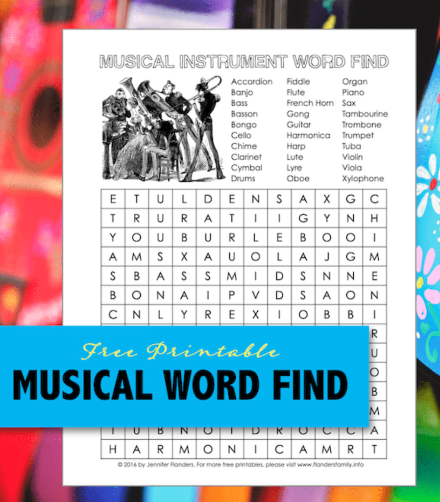 Musical instrument word-find game from Flanders Family Home Life (free).