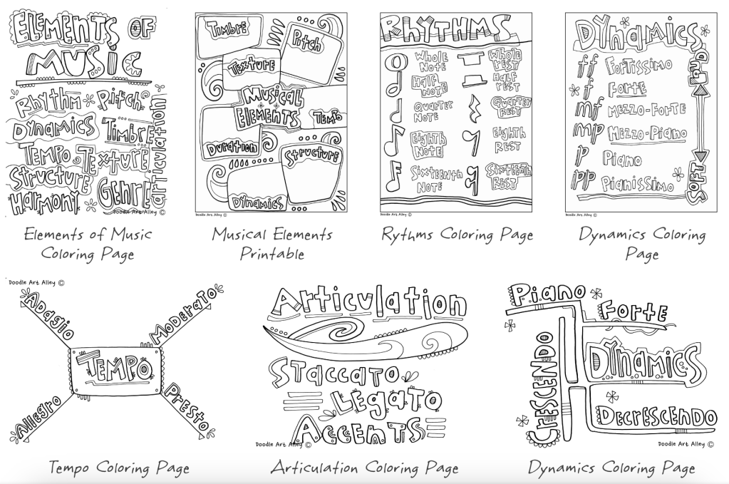 Musical elements classroom doodles colouring pages from Doodle Art Alley (free) – I have used some of these in the past, but I like the gentle educational aspect.