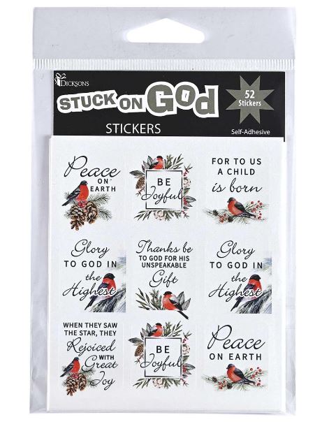 …for something a little special, I picked up some sticker sheets from our local Mennonite bookstore, and cut them up so that folks could grab a couple from a basket. I got two styles; some seasonal birds, and some that were star-themed.