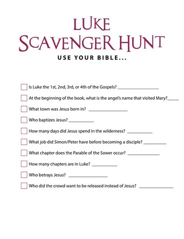 Luke Bible scavenger hunt from Children’s Minstry Deals (free), since it’s the last week of our Book of Luke series.
