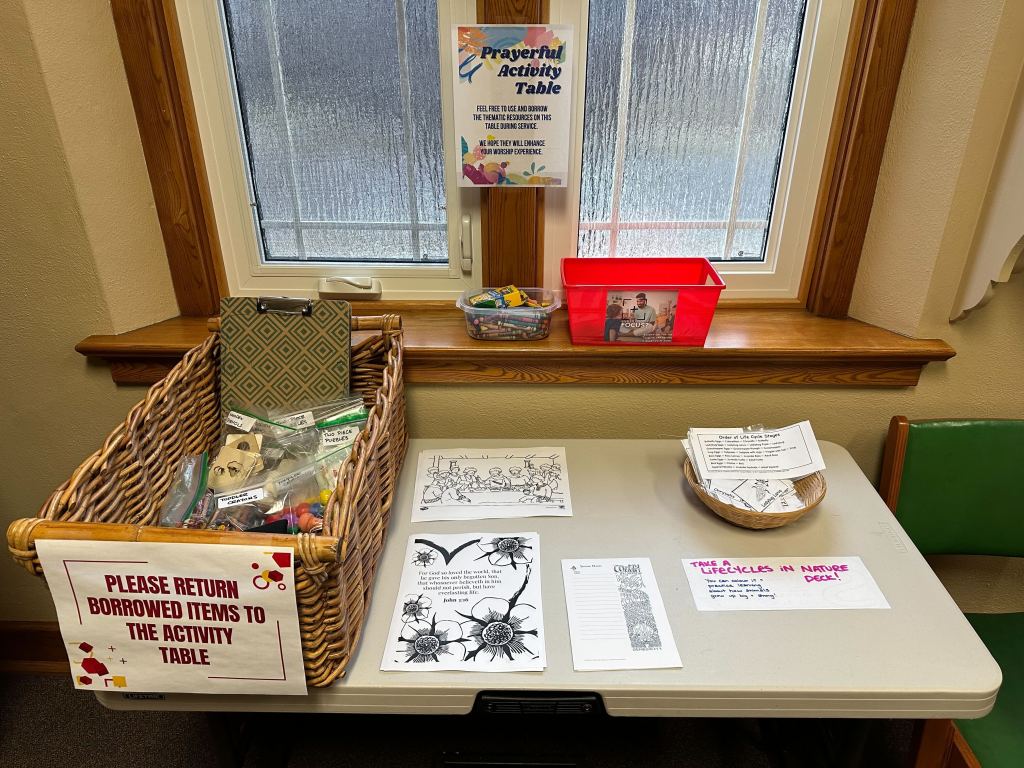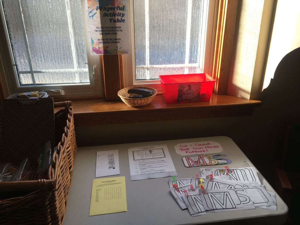 My name is emmy, and I attend a progressive Mennonite conference church in Ontario, Canada. I grew up with my grandmother telling me that idle hands were the devil’s playthings – and I must have listened, because I focus best when my hands are busy! In order to contribute to our congregation being inclusive to people of all ages who may be able to best participate in worship when they have something tangible to do, I prepare a weekly prayerful activity table full of resources to engage with during weekly worship services. They change week to week according to the theme of our service. I wanted to share these resources so that people from our congregation who worship from home via Zoom or physical mailouts can find them and engage with them if they want to, but also so that they’re available to people who might be doing faith formation or ministries of their own, homeschooling, Bible study – however you build your relationship with God. As time goes on, I may share other creative resources from projects that my partner and I work on related to our Mennonite faith as well!