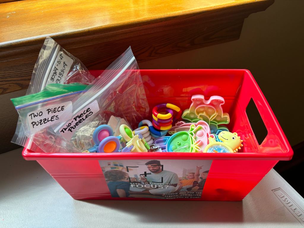 In our box of fidgets are primarily things like popper toys. These are pretty popular, and the items in the box originally came from a package of party favours that I got through my local Buy Nothing group. The biggest challenge with these is finding things that are quiet and safe for the littlest members of our congregation. I tried play dough for a while, which I purchased affordably at Ikea. It was a terrible idea! So messy, and never got put back properly, so it just ended up being wasted.