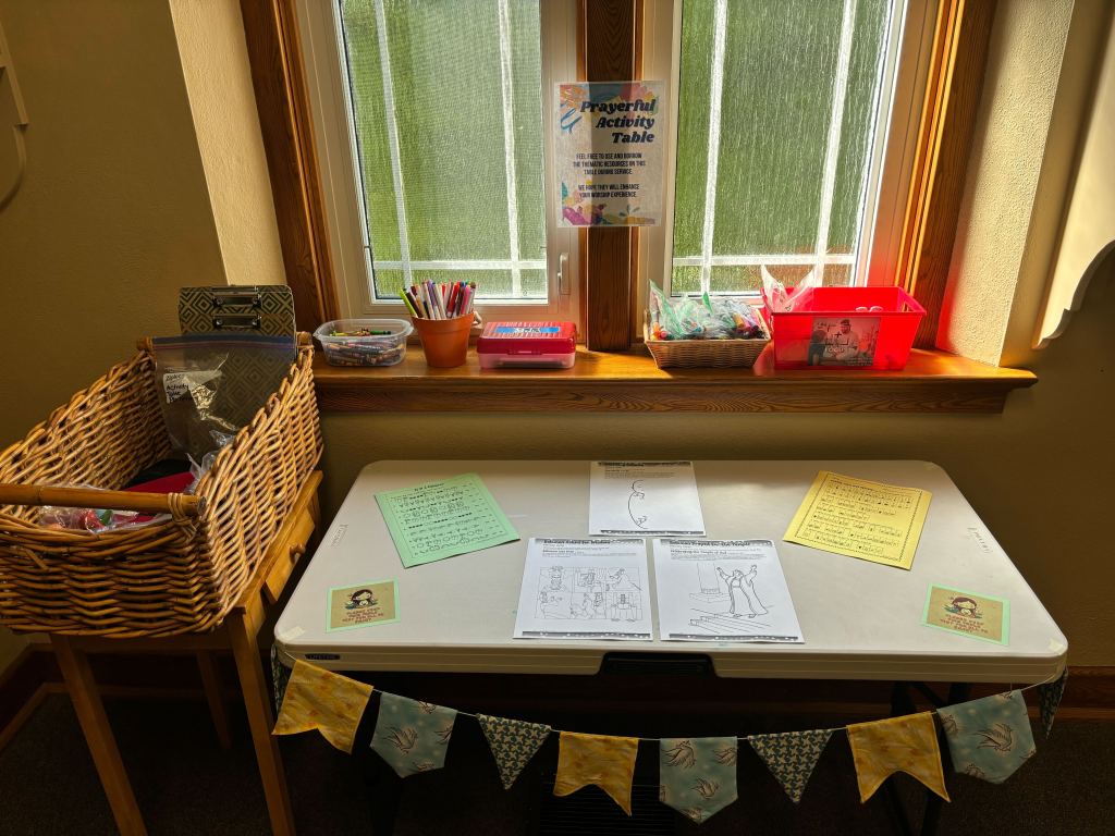 From week to week, the activities and resources that are offered on the Prayerful Activity Table change according to the theme of the sermon, noteworthy events in our community and the world, and/or the scripture that we’re using during worship. They are meant to enhance the worship experience for those who want to engage in a more tactile or embodied way – kids or adults!